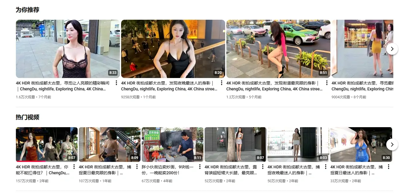 油管街拍UP主Exploring China的街拍作品,该UP主作品质量很高,还需要付费加入会员,主要地点是成都太古里,比较有烟火气息的真实街拍,就像你在逛街看美女是一样的感觉